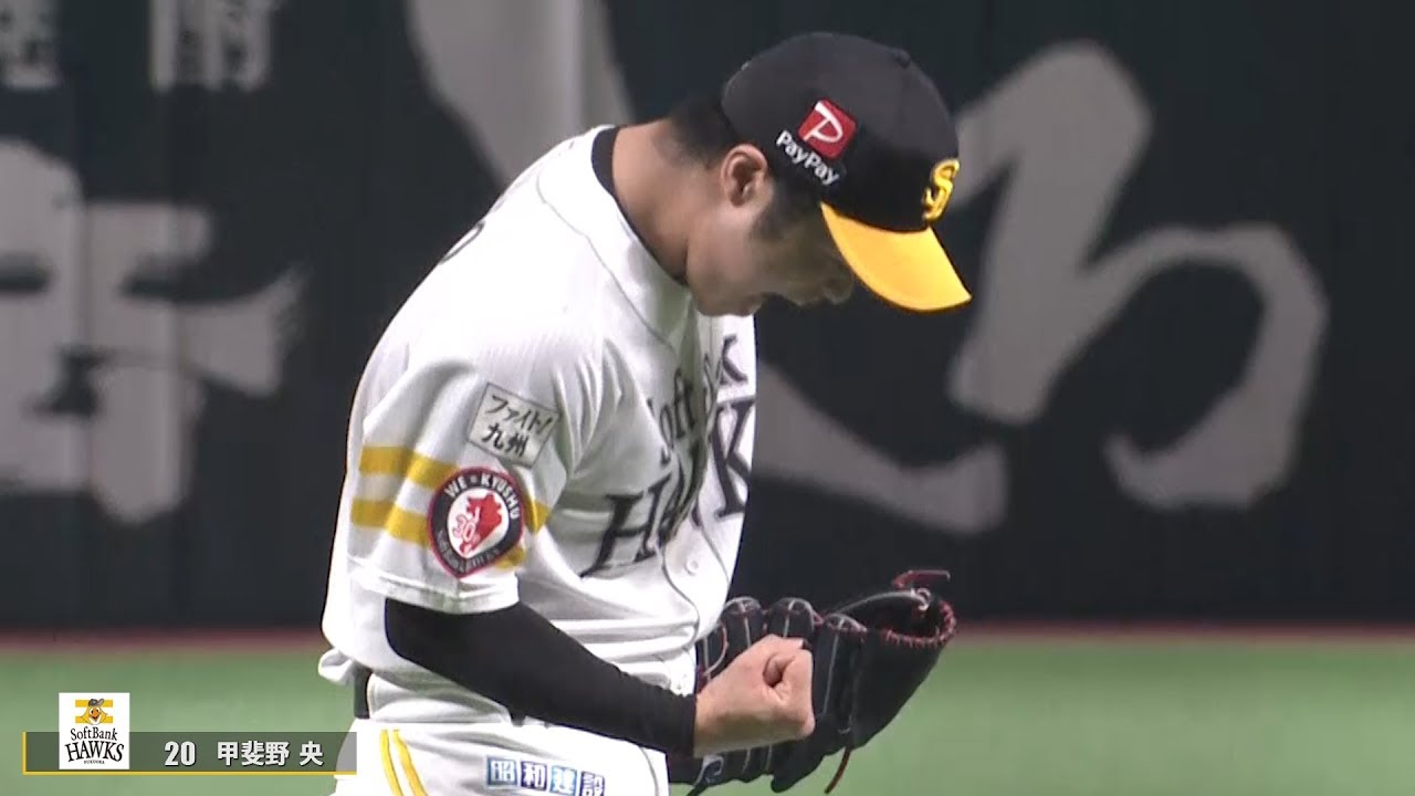 ルーキーが強心臓を発揮!! 福岡ソフトバンク・甲斐野央が1アウト3塁の場面から登板。東北楽天・ウィーラーとフェルナンドを気迫で打ち取った甲斐野はベンチでホッと安堵。