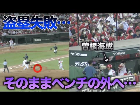 坂倉将吾選手の打席で盗塁を試みますが失敗しアウト…