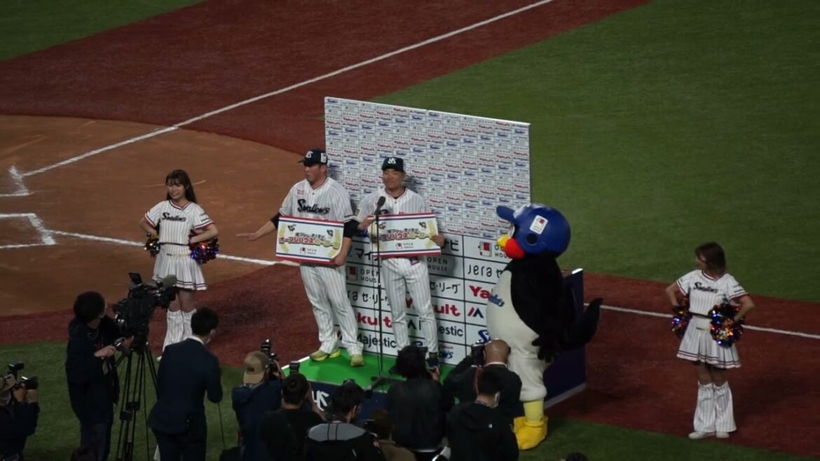 試合後 ヒーローインタビューを受ける中村悠平選手、大西広樹投手(東京ヤクルトスワローズ)。