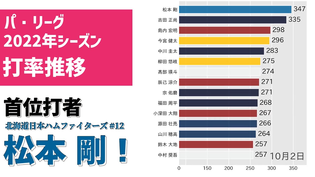 完走お疲れ様 .350に乗せてほしかったなあ 規定ギリギリでも、開幕直後からラストまで文句なし首位打者だった 次点に甘んじたとはいえ吉田正尚も万全じゃなかったはずなのに流石ですわ 0:00 パシフィックリーグ開幕 0:18 5月 0:31 6月 0:44 7月 0:53 吉田正尚、規定打席到達 0:56 8月 1:09 9月 1:33 10月 #プロ野球Hokkaido Nippon-Ham FighterskjozkNPB北海道日本ハムファイターズ松本剛 NPBHUB.COM | The Fanbase of Nippon Baseball & Nippon Professional Baseball