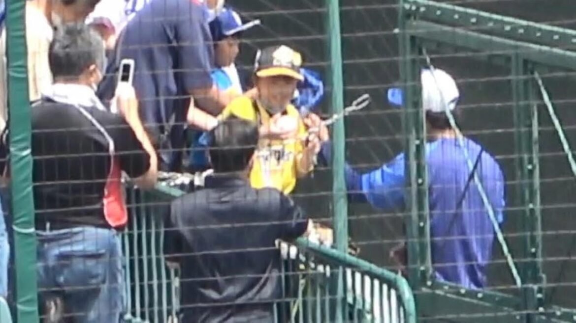 高橋宏斗に渡したボールにサインしてもらい飛び上がって喜ぶ阪神ファンの少年(2023年5月4日)