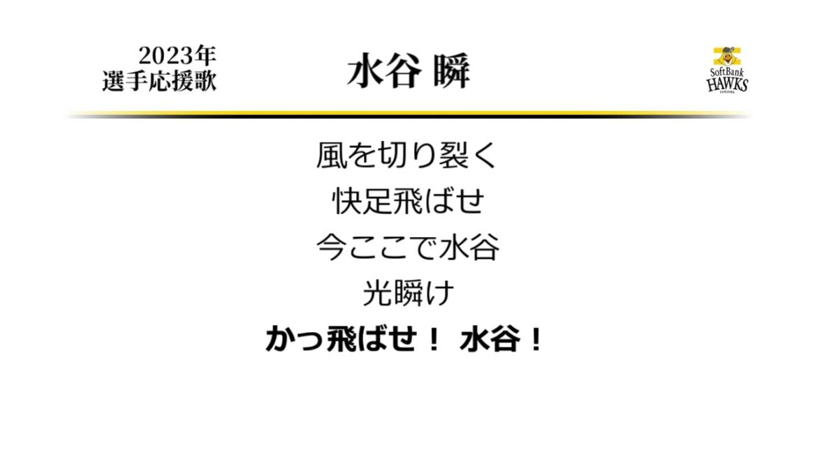ソフトバンク水谷選手の応援歌です。 一方で、この動画を作った時点では、二軍でも不振で三軍降格とのニュースも。 後から入団した選手で、汎用応援歌の中実績を積み上げる選手も増えているだけに、 個人応援歌持ちの水谷も、負けじと奮起してもらいたいところですが…。 Fukuoka SoftBank HawksFukuoka SoftBank Hawks (Baseball Team)Shun Mizutani (Baseball Player)なんぶふじ応援歌水谷瞬福岡ソフトバンクホークス NPBHUB.COM | The Fanbase of Nippon Baseball & Nippon Professional Baseball