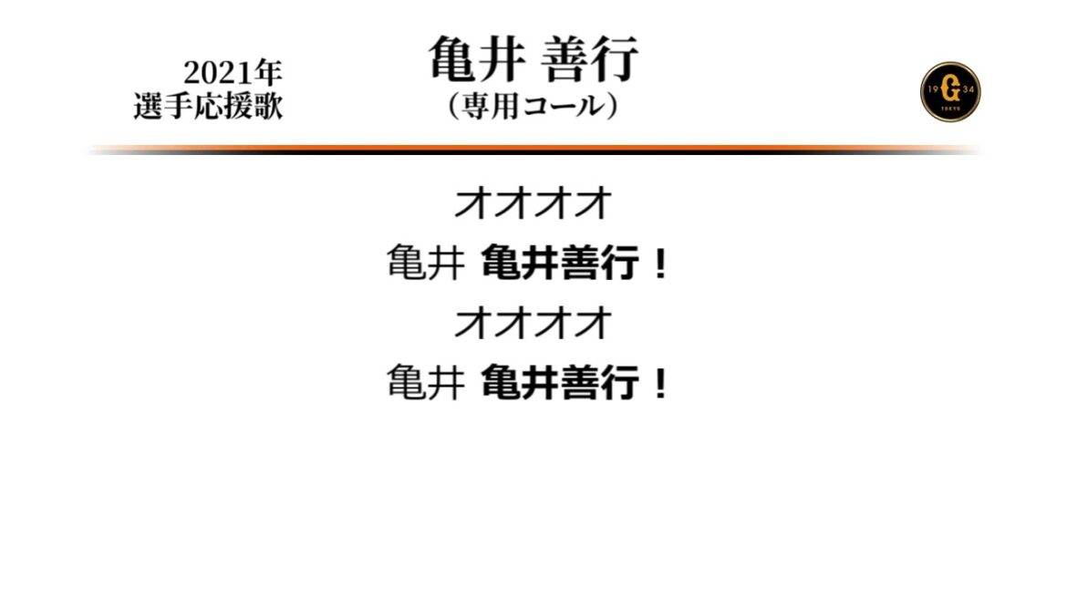 巨人亀井の専用コールです。 二軍の応援が一軍でも使われるようになるケースというのは珍しいですが、 この時代の巨人は他にもデュークとか、そういうルートがありました。 ○亀井応援歌(巨人2作目)→https://youtu.be/8VRgk6QddiI Yomiuri GiantsYomiuri Giants (Baseball Team)Yoshiyuki Kamei (Baseball Player)なんぶふじ亀井善行応援歌読売ジャイアンツ NPBHUB.COM | The Fanbase of Nippon Baseball & Nippon Professional Baseball