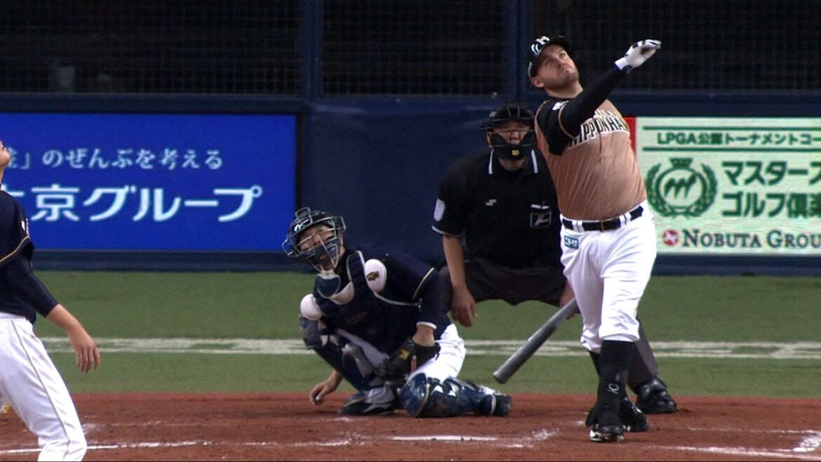 4回、一死一塁の場面で打者はレアード。速球をとらえた打球は左中間スタンド上段へ!逆転の33号2ランホームランを放った。 (9月26日 オリックス-日本ハム)
