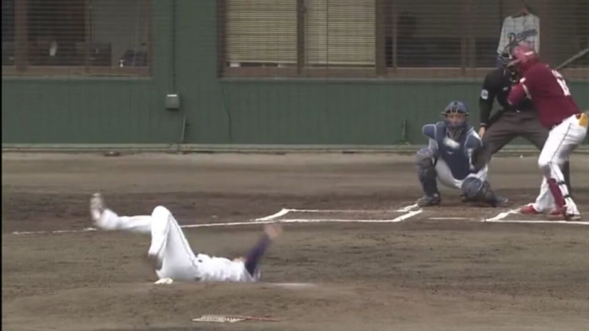 ボールを投げた瞬間体勢を崩し倒れる込む岡田投手。10分以上立ち上がることができず、マウンド近くに救急車が到着し、緊急搬送されました。