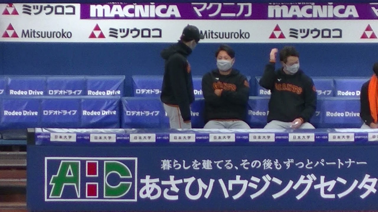 中井大介の引退セレモニーをベンチで並んで待つジャイアンツ選手 【横浜DeNAベイスターズ対 読売ジャイアンツ2021年10月20日】