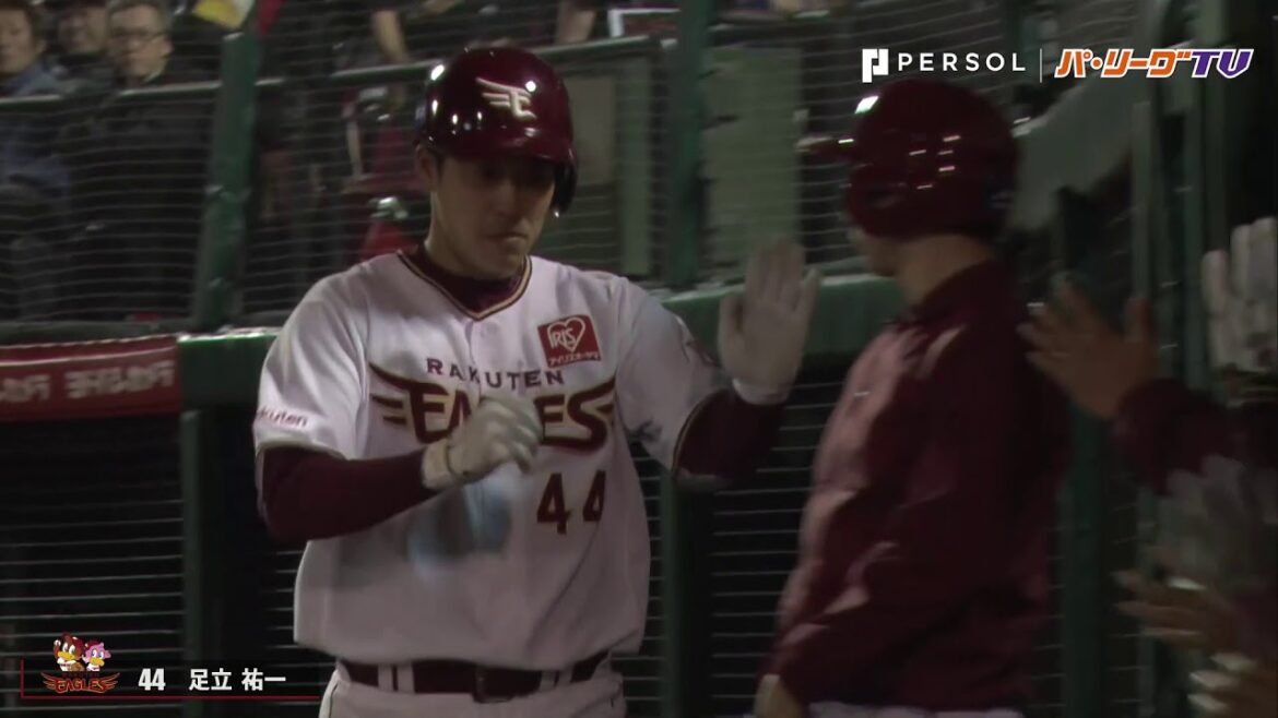 東北楽天・足立は犠牲フライを放ち得点に貢献するも、ややうつむきがちなハイタッチ。