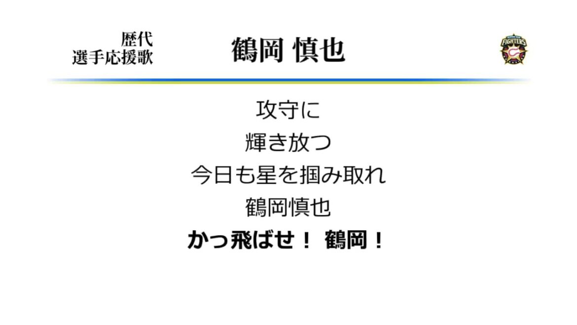 鶴岡慎也の日本ハム時代2作目となる応援歌です。 現役晩年は選手兼任でコーチも務めていたのもあり、 引退後はそのまま即コーチに転身するものとばかり思っていましたが…。 ○鶴岡応援歌(日本ハム1作目)→https://youtu.be/-dosSJtTW2s ○鶴岡応援歌(ソフトバンク時代)→https://youtu.be/yjpacVW1sUA Hokkaido Nippon-Ham FightersHokkaido Nippon-Ham Fighters (Baseball Team)Shinya Tsuruoka (Baseball Player)なんぶふじ北海道日本ハムファイターズ応援歌鶴岡慎也 NPBHUB.COM | The Fanbase of Nippon Baseball & Nippon Professional Baseball