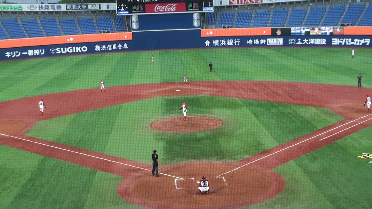 東芝の先発は、昨年指名されなかった 岡野 祐一郎(25歳・青学大出身)右腕。球速こそ常時140キロ台~MAXで147キロぐらい出ていましたが、それほどストレートに球威・勢いは感じません。ハマスタのガンは、常時5キロ程度速く表示される印象なので、私の目測でも常時130キロ台後半~140キロ台前半に見えます。この球場よほど前で観ないと角度がつきすぎるのと、トラックマンの影響なのかまともにスピードガンが計測できません。したがってマイガンとは、平気で10キロ程度の差が生じて参考になりませんでした。ただし角度の少ない前方で球速を計測すると、球場のガン表示に影響すると注意されたことがあるので、球場前方にはあまり座らないことにしています。