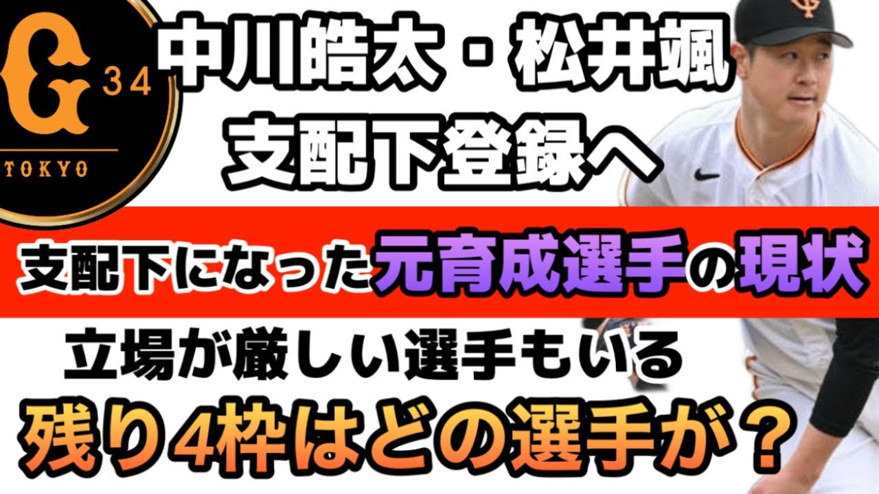 2023年読売ジャイアンツの育成選手である中川皓太・松井颯が支配下登録となった。ジャイアンツは今シーズン57名の支配下登録者でスタートしたがすでに9名が昇格して残り4名とるが実質、新助っ人外国人を7月までには1名を獲得する事を予想されるので実質3名。