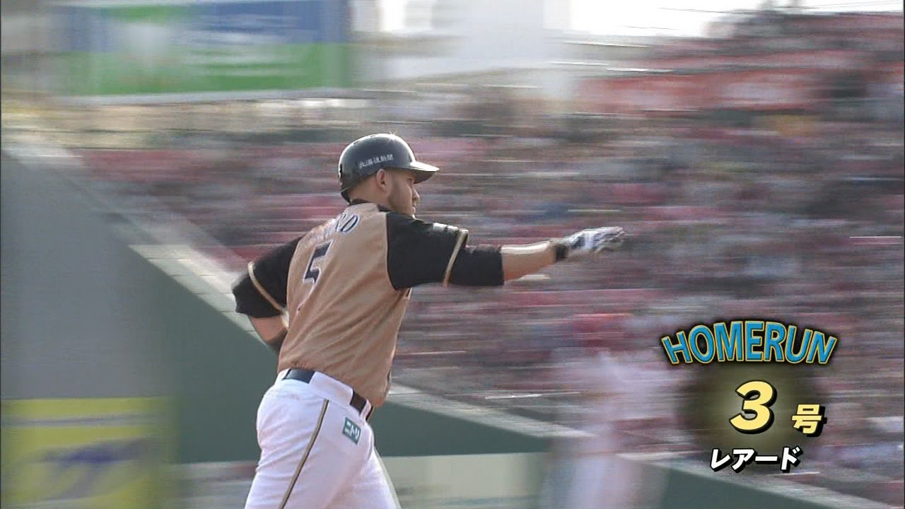4回、レアードが放った打球はレフトスタンドへ。第3号ソロホームランで同点に追いついた。 (4月18日 楽天-日本ハム)