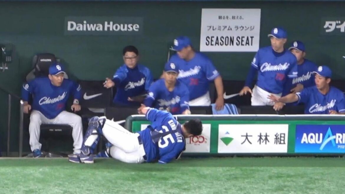 木下拓哉ナイスキャッチ!ベンチの柵に接触するもボールを離さず(2023年5月20日)
