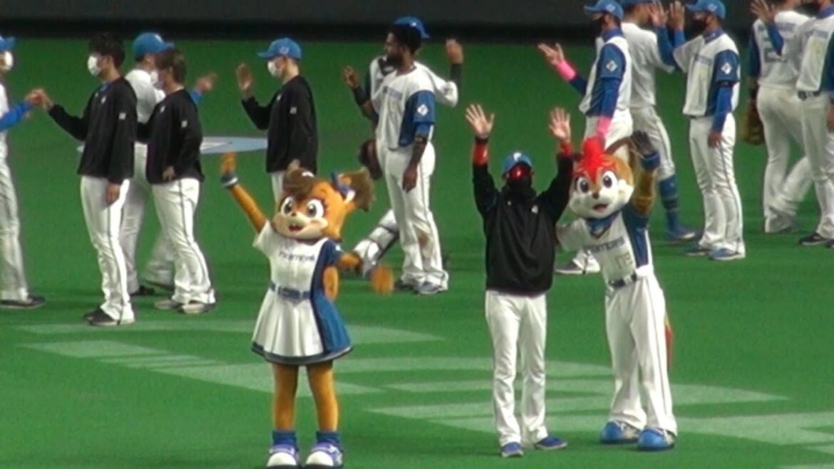 試合後のハイタッチ列から外れて、新庄BIGBOSSはフレップとポリーとでレフトスタンドへ手を振っていました