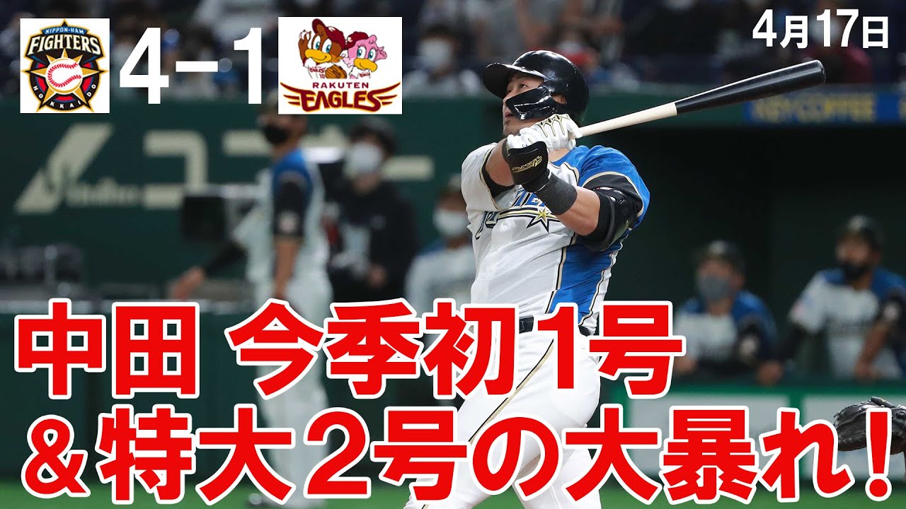 4月17日のナイスプレー集は、上沢の今季初勝利、中田今季1,2号本塁打、石井の駄目押し本塁打など。