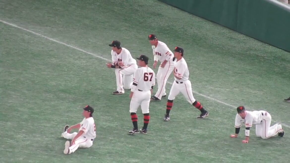 試合前のウォーミングアップ 廣岡大志と重信慎之介が会話中〜2023年5月13日読売ジャイアンツ対 広島カープ