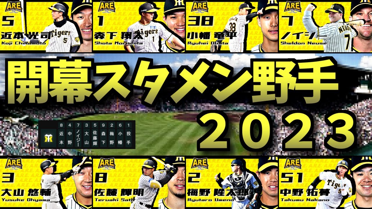 #阪神 #登場曲 打席前のモニター映像風 選手紹介ムービー2023 0:03 近本光司選手 0:23 中野拓夢選手 0:43 ノイジー選手 1:03 大山悠輔選手 1:23 佐藤輝明選手 1:43 森下翔太選手 2:03 梅野隆太郎選手 2:23 小幡竜平選手 ★2023超short登場演出PVまとめ【登場曲発表次第更新予定】 ★2022超short登場演出PVまとめ ★2021超short登場演出PVまとめ Hanshin Tigers小幡竜平阪神タイガース NPBHUB.COM | The Fanbase of Nippon Baseball & Nippon Professional Baseball