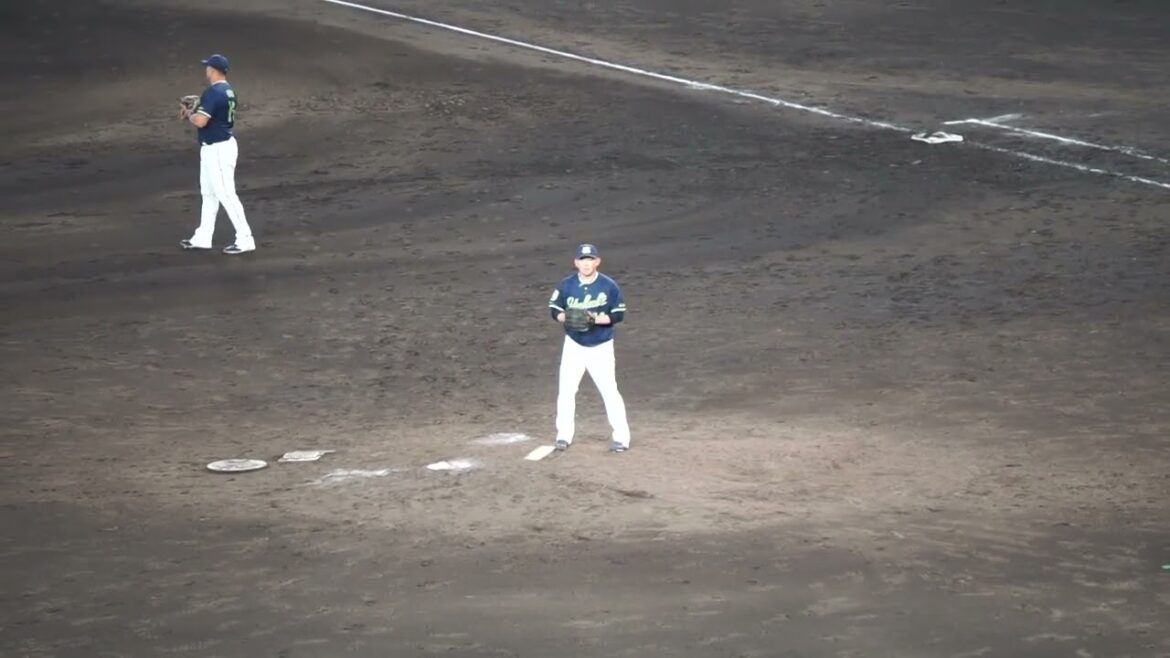 12回裏 大西広樹投手がマウンドへ投球練習を始める。
