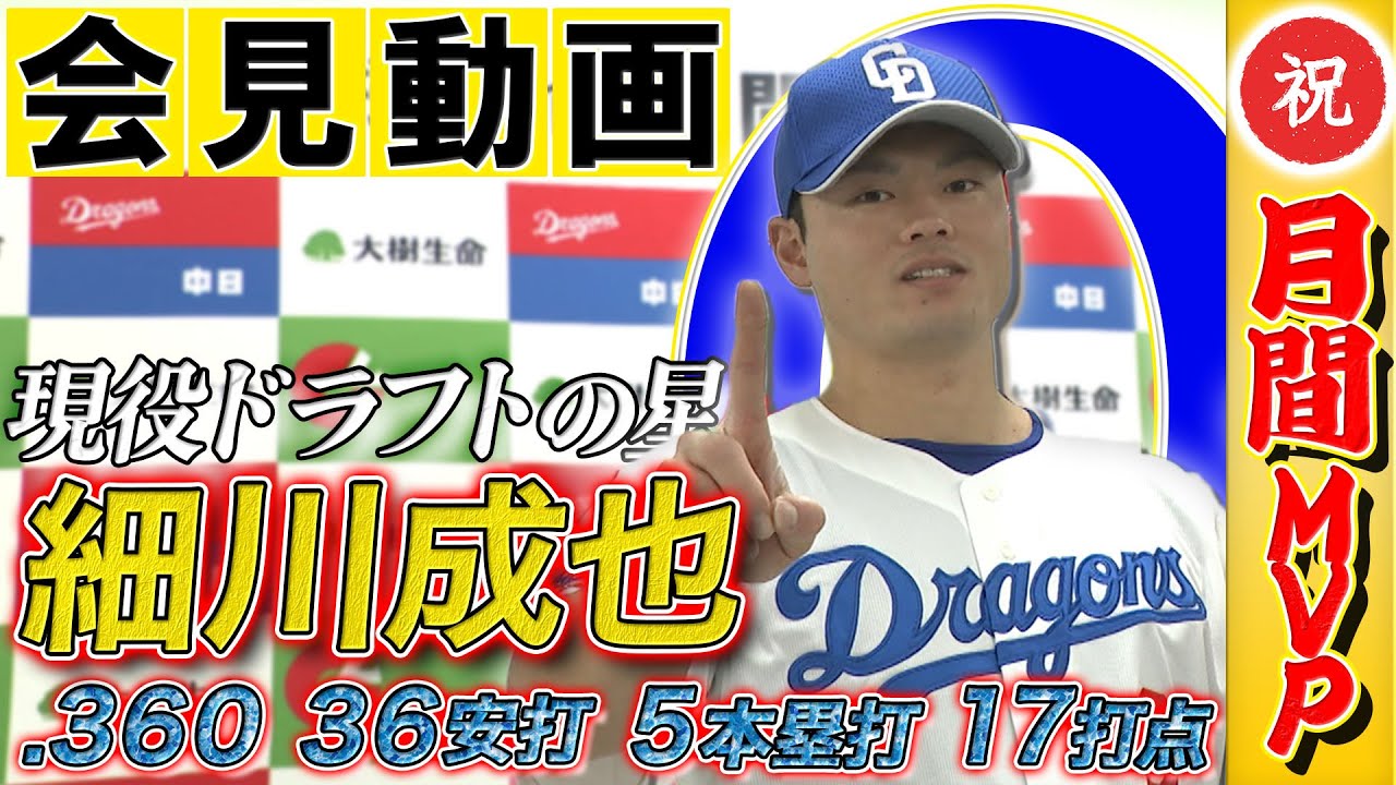 日本野球機構(NPB)は8日、2023年5月度の大樹生命月間MVPを発表。セ・リーグ野手では中日ドラゴンズ・細川成也外野手(24)が選出された。昨年オフ実施された現役ドラフトで加入した期待の和製大砲は25試合に出場し、100打数36安打、打率.360、5本塁打、17打点、出塁率.396、長打率.590を記録し、プロ7年目で初の受賞となった。中日からの選出者は、去年9・10月度のD・ビシエド選手以来。