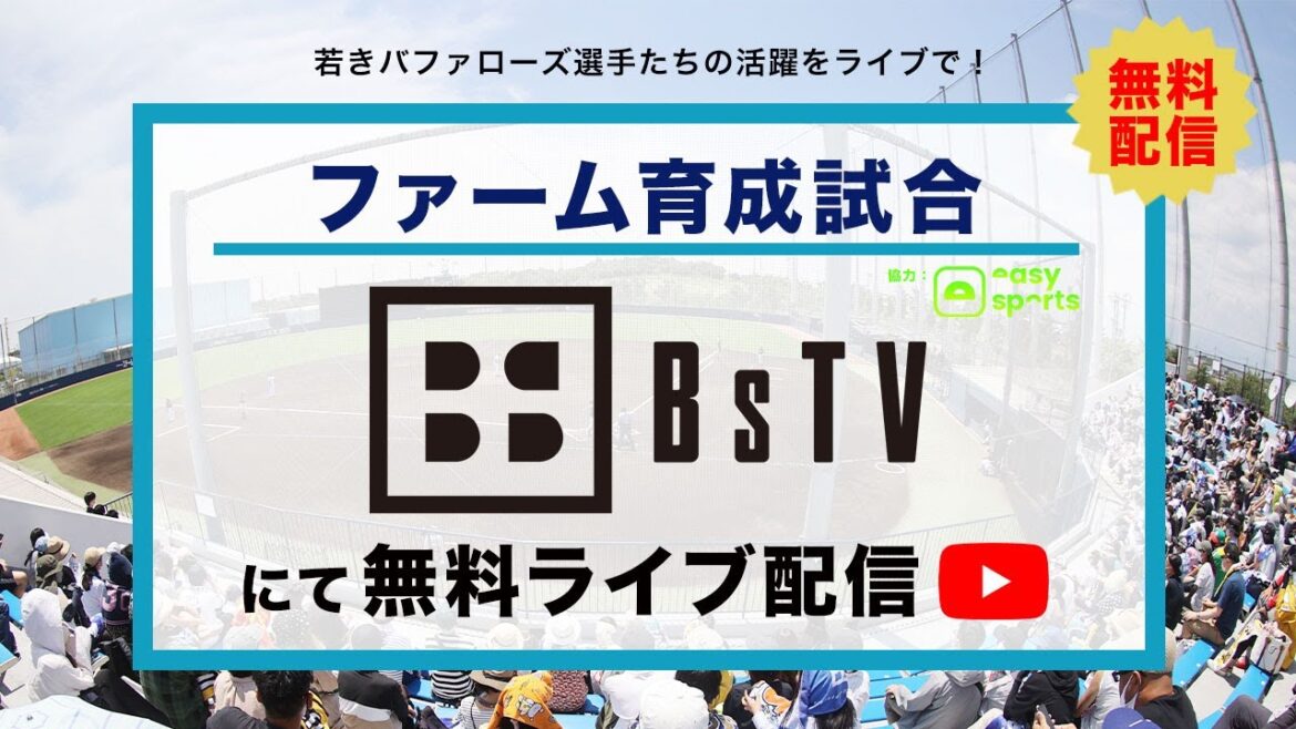 杉本商事バファローズスタジアム舞洲で行われるファーム育成試合を、今シーズンもイージースポーツ協力のもと、球団公式YouTubeチャンネル「BsTV」にてライブ配信いたします!この試合は試合終了まで配信いたします。