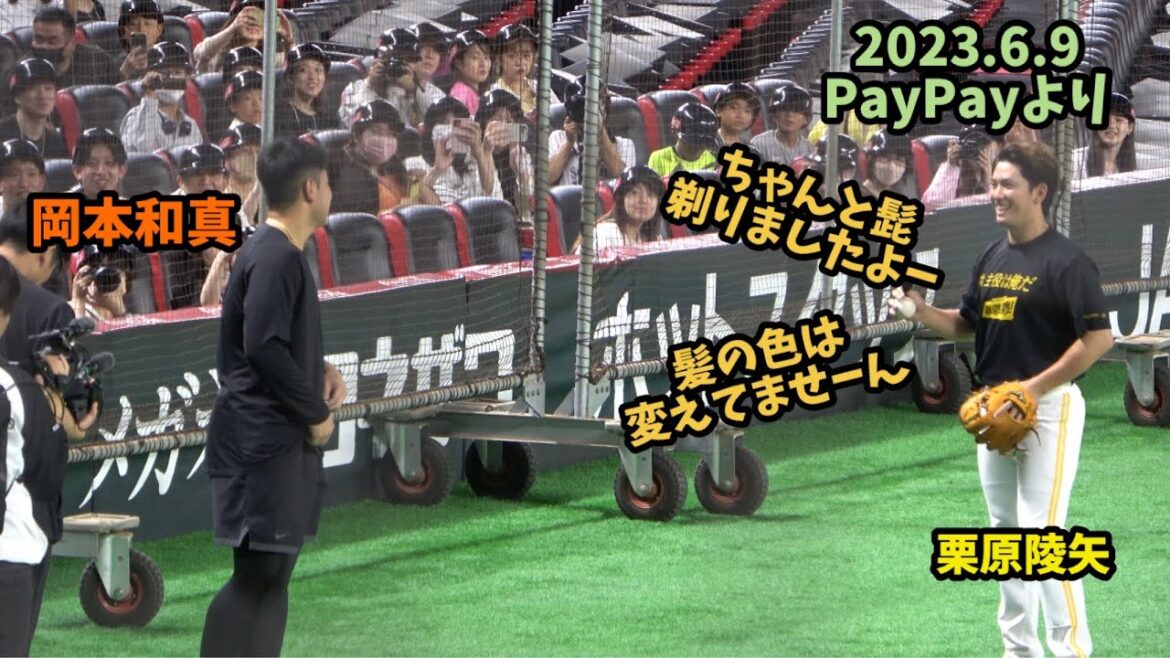 髭を剃った事をアピール🤣ソフトバンクホークス栗原陵矢と岡本和真が仲良く試合前談笑😀2023.6.9ホークス対巨人