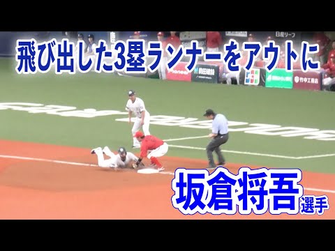 カープ坂倉将吾選手が3塁ランナーの飛び出しにしっかり反応しアウトにする!