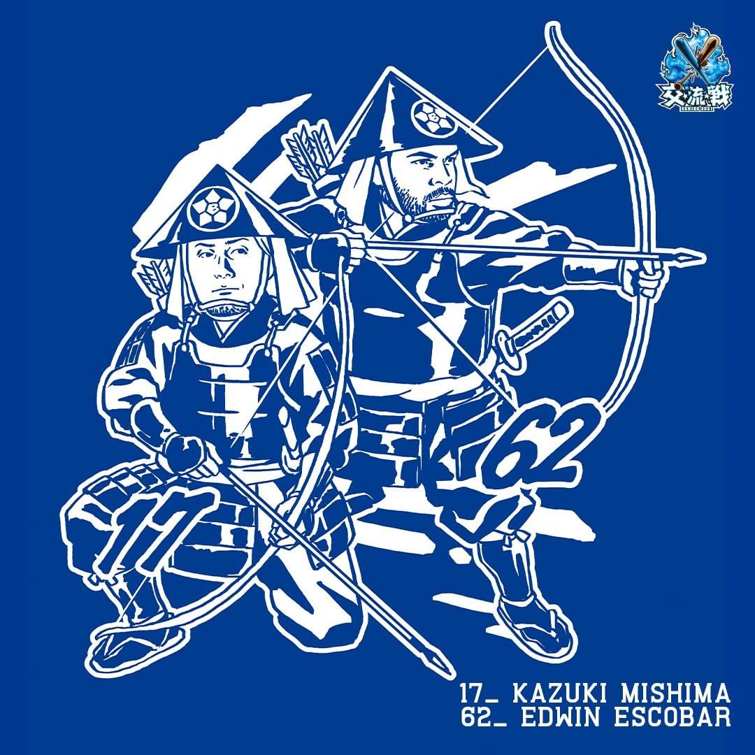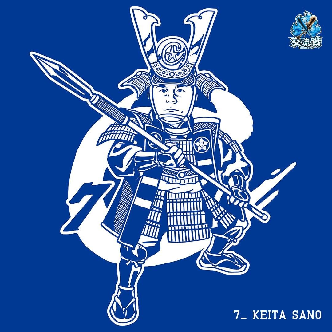 #佐野恵太 選手は大きな槍を持ち先陣を斬るキャプテン、#三嶋一輝 選手・#エスコバー 選手は弓隊、、、など「戦国」のテーマに合わせた選手たちのイラストは全13種類。