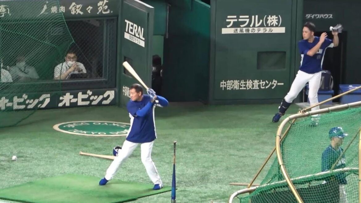 引退表明の福留がトスバッティング。後方で動きを合わせる三好大倫(2022年9月9日)
