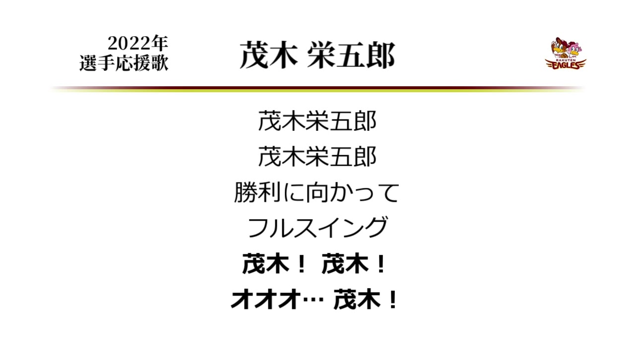 楽天茂木選手の応援歌。個人的には3作目としてナンバリング。 最近ではだいぶ定着してきたものの、 応援歌変更当時はだいぶ賛否両論巻き起こしていた筆頭という印象も。 ○草野応援歌(楽天茂木1作目流用)→https://youtu.be/YkMYJ2uSSvA ○茂木応援歌(楽天2作目交互演奏Ver.)→https://youtu.be/xfJ9dF7gpb0 Eigoro Mogi (Baseball Player)Tohoku Rakuten Golden EaglesTohoku Rakuten Golden Eagles (Baseball Team)なんぶふじ応援歌東北楽天ゴールデンイーグルス茂木栄五郎 NPBHUB.COM | The Fanbase of Nippon Baseball & Nippon Professional Baseball