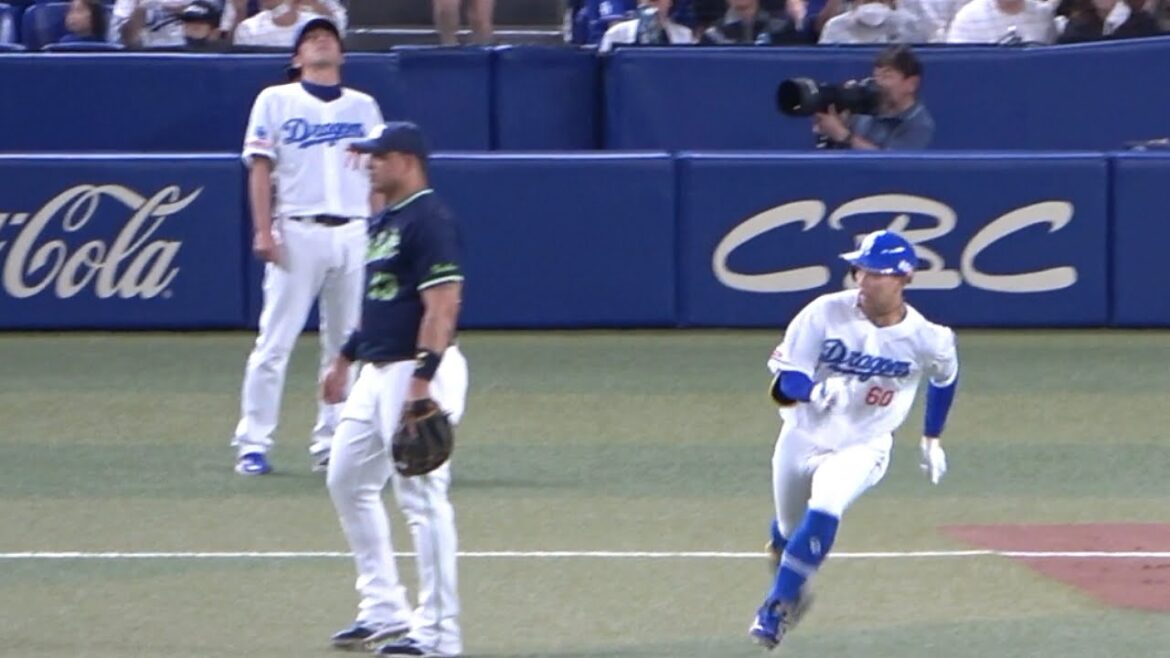 岡林がほんのあと僅かでホームランというフェン直ツーベース!荒木コーチのリアクション(笑) (2023/06/25)