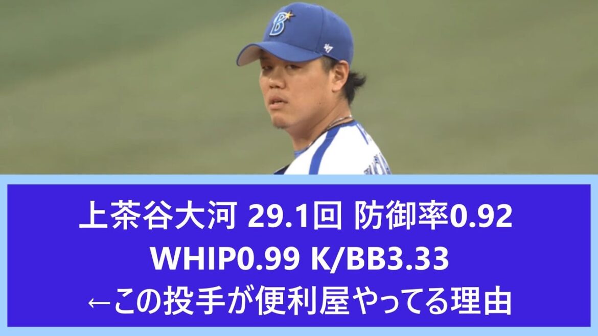 上茶谷大河 29.1回 防御率0.92 WHIP0.99 K/BB3.33 ←この投手が便利屋やってる理由