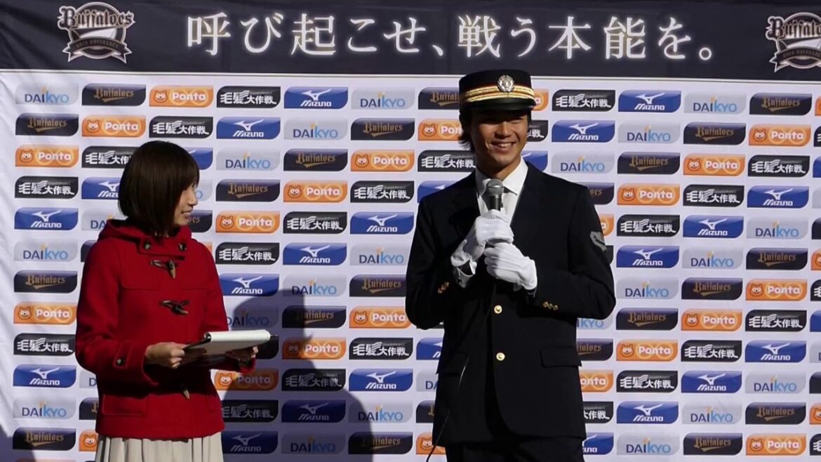 2016年12月10日(土)大阪市営地下鉄・京橋駅の一日駅長に任命されたオリックス・バファローズの山﨑福也投手。トークショーの最後に、一日駅長の感想と来シーズンに向けてファンへのメッセージを語る。MCは竹村美緒さん。