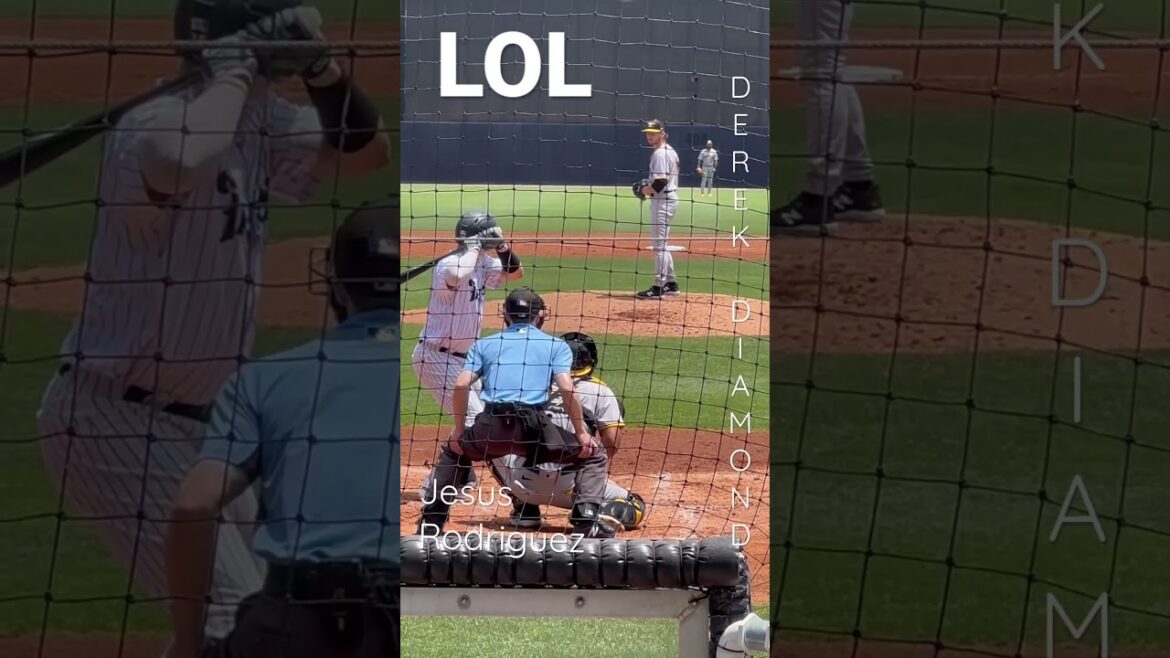 The hitter Jesus Rodriguez is in the box for the Tampa Tarpons. He is waiting for Derek Diamond, the pitcher, to deliver. Diamond takes his time and Rodriguez calls a late timeout. Diamond had stated his delivery and he launches the ball into the backstop. This one made me laugh.