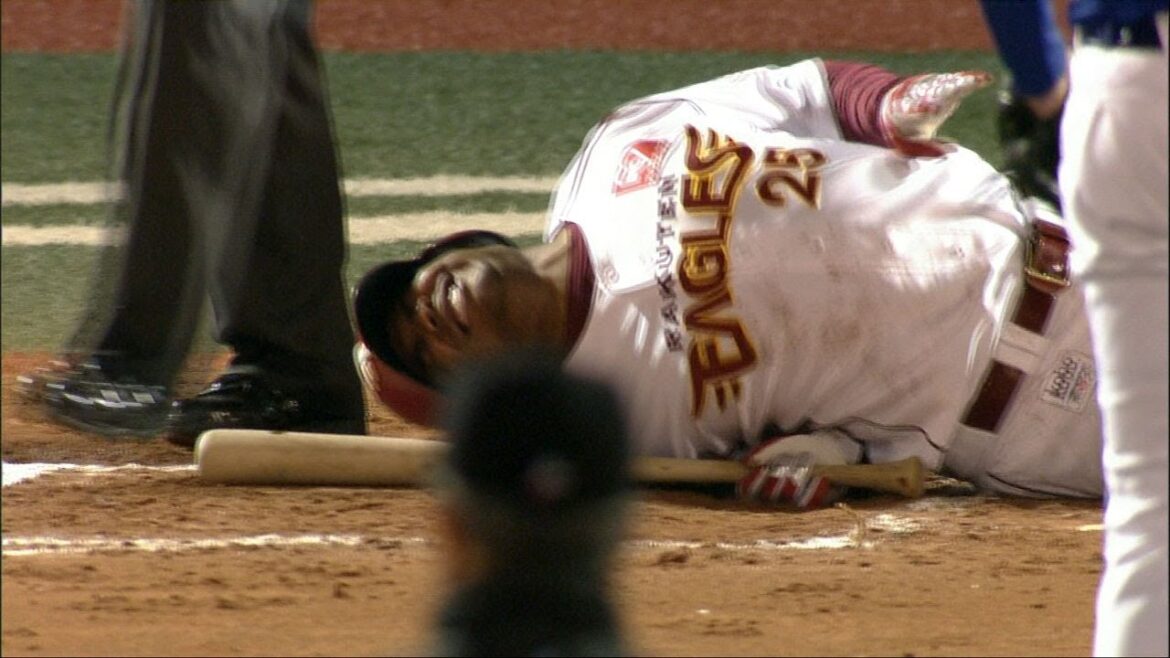 6回、DeNAの菊池が投じた球が東北楽天のジョーンズの背中に直撃。痛みのあまりジョーンズはグラウンドに崩れ落ちた。 (5月31日 楽天-DeNA)