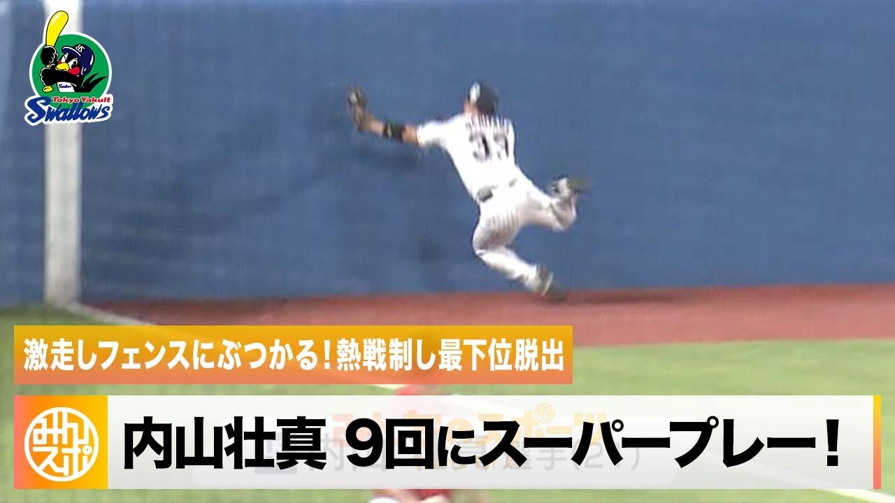 しかし9回、ホームランが出れば同点というピンチを迎え、ヤクルトが対する西川龍馬(28)。レフトへの打球に8回から守備固めで起用された内山壮真(21)が激走しフェンスにぶつかりながらキャッチするスーパープレー!