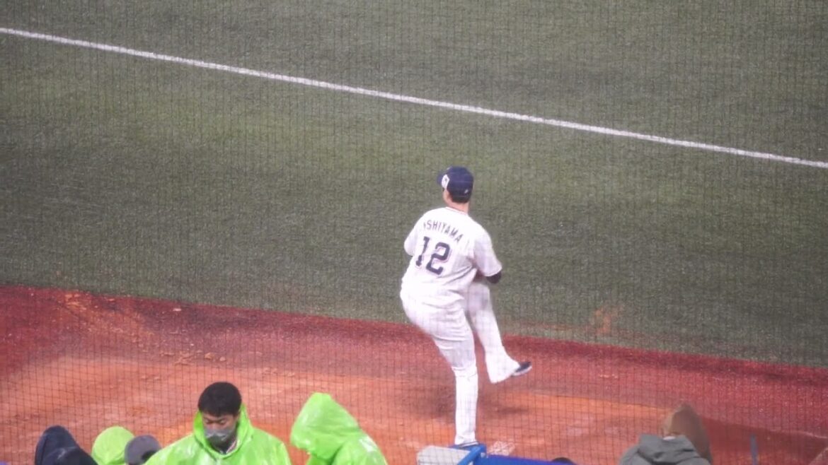 6回裏 石山泰稚投手がブルペンで投球練習を始める。