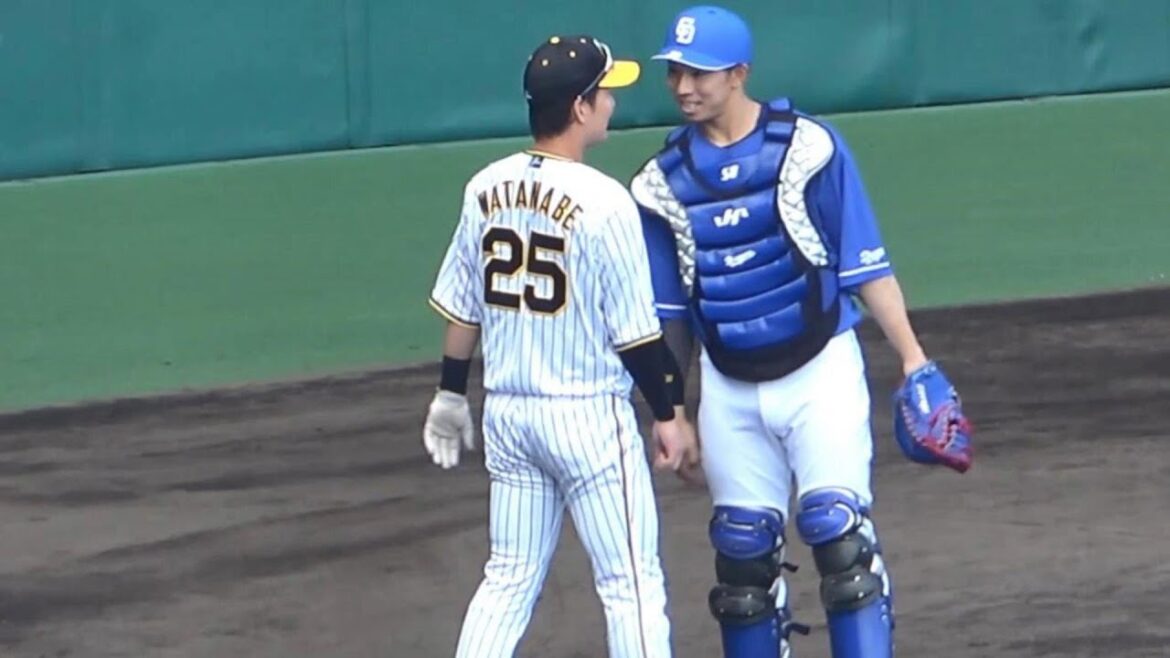 去年まで日本ハムでチームメイトだった渡邉諒と言葉を交わす宇佐見真吾(2023年6月27日)