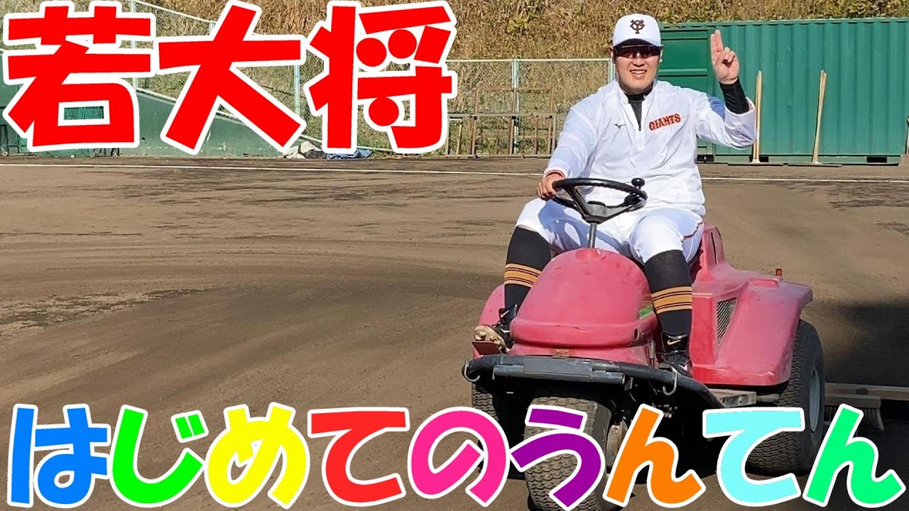 若大将・岡本和真選手が、練習後のグラウンドをカートに乗って綺麗に整備していました。初めてカートに乗る岡本選手はご満悦の表情です。