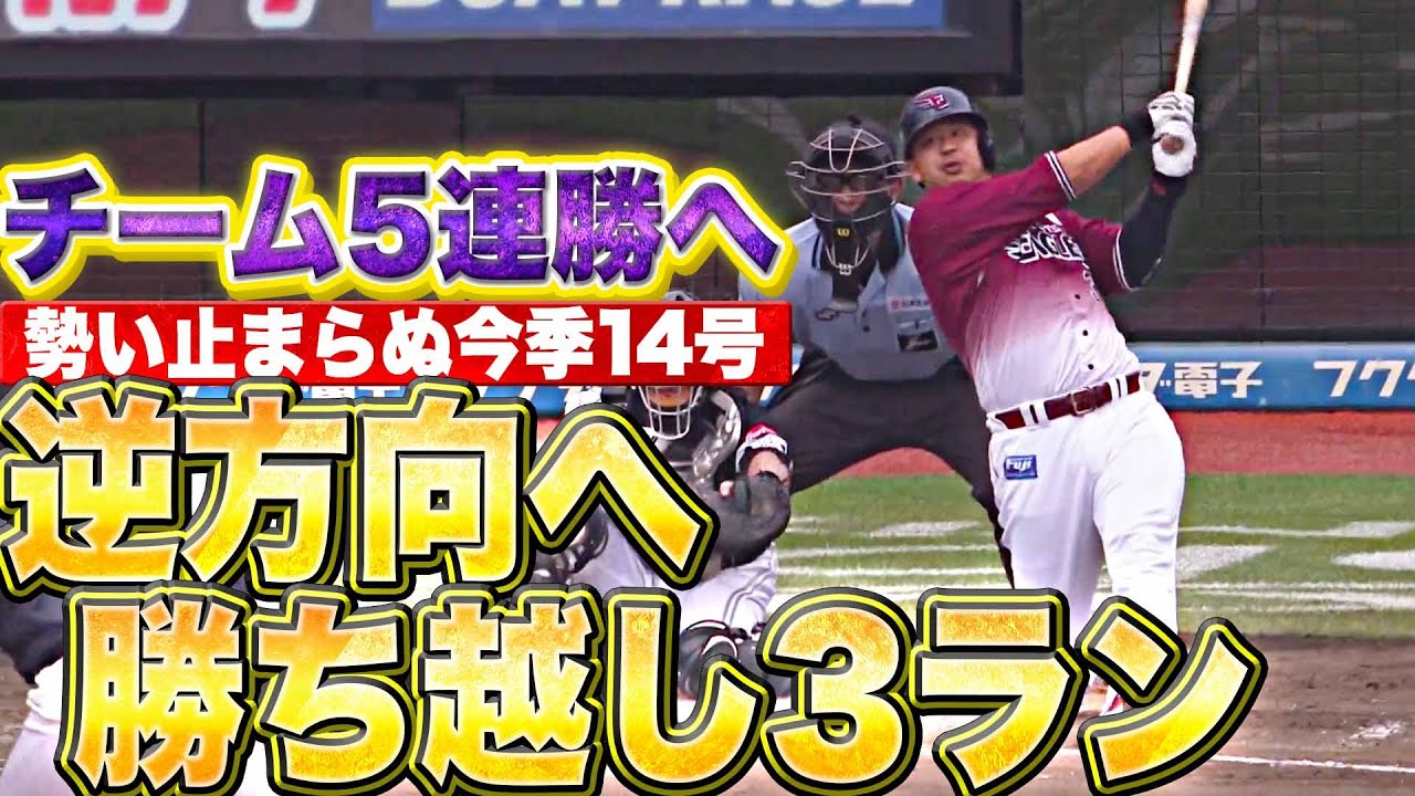 外角寄りのストレートを打ち返し、逆方向に打ちあがった打球がそのままスタンドへ。東北楽天・浅村栄斗の14号3ランで勝ち越しに成功。この回一挙4得点で試合をひっくり返し、5連勝へ向け試合の主導権を握っている!!