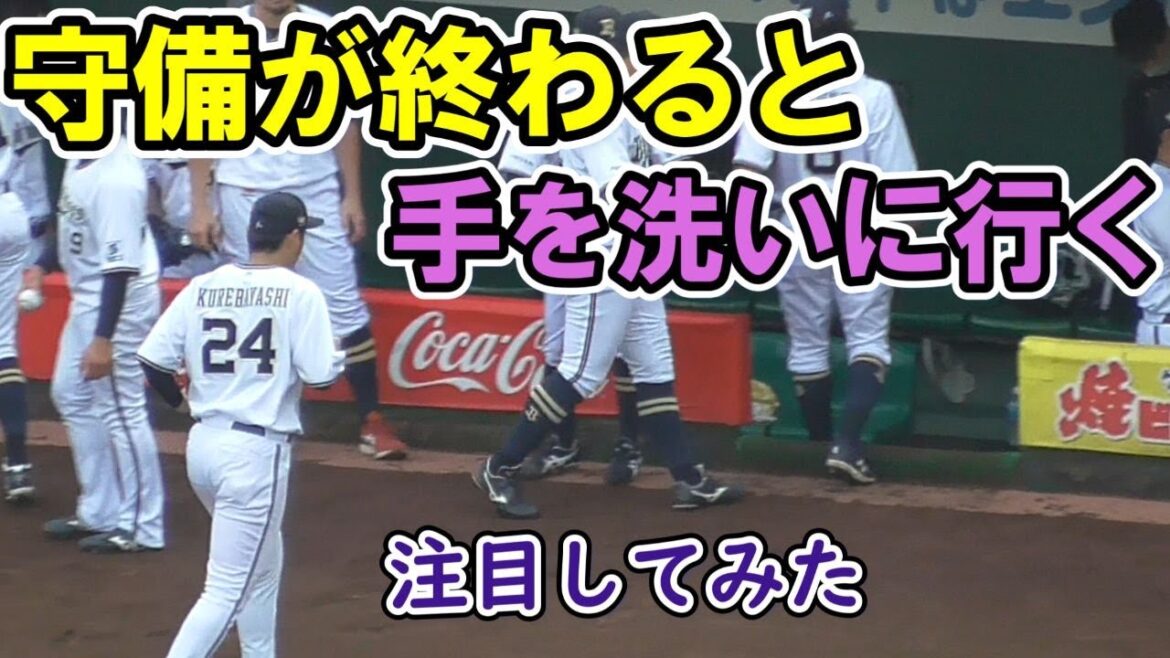 「紅林は守備が終わると、先頭打者でない限り必ず手を洗いに行く」とラオウ(杉本裕太郎)が言っていたとコメントで教えていただき、その部分に注目してみました。