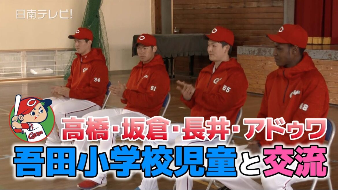 春季キャンプ中の広島東洋カープ・新人選手が第3クール前のオフの日を利用して、吾田小学校(東嘉太郎校長・全校児童431人)で交流をしました。