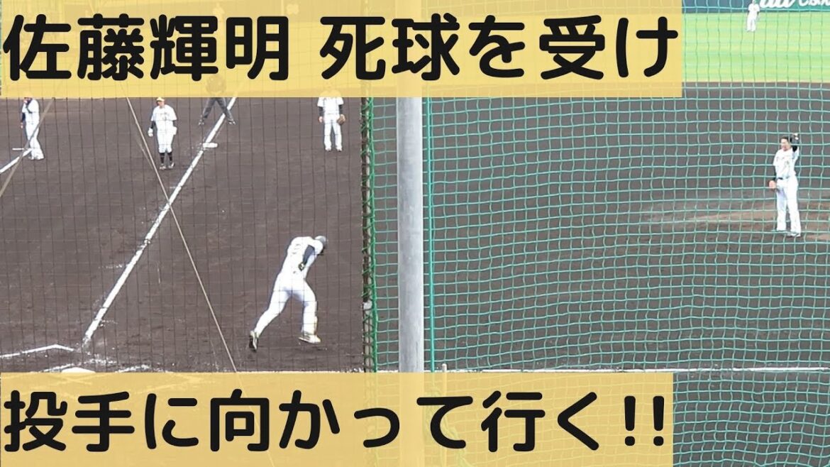 佐藤輝明選手が死球を受け、佐藤輝明君は渡邉雄大投手に向かって行きました。