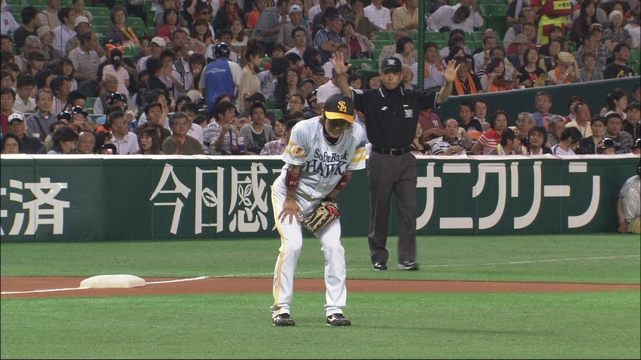 1回、巨人・藤村の内野安打を福岡ソフトバンクのショート・明石がジャンピングスロー。惜しくもアウトにはならなかったが、明石はこのプレーで腰を負傷し、今宮健太が急きょ途中出場となった。(2012年6月6日 福岡ソフトバンクホークス対読売ジャイアンツ)