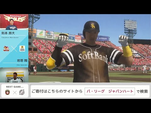 「#パーソル チャリティマッチ パ」2日目の第2戦、楽天・則本昂大投手と福岡ソフトバンク・岩嵜翔投手による試合ダイジェスト!岩嵜投手がさすがの腕前を発揮してリードを奪うと、柳田悠岐選手を操作して見事な一発!チャリティマッチ初アーチを記録した!