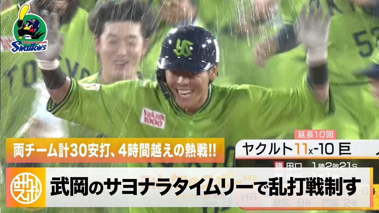 両者譲らないまま試合は延長戦へ。10回、この日途中出場の中村悠平(33)がサヨナラのチャンスを作ると、ファンの期待を背負い打席には6番・武岡龍世(22)。両チーム計30安打、4時間越えの熱戦に終止符を打つサヨナラタイムリー。ヤクルトが乱打戦を制した。