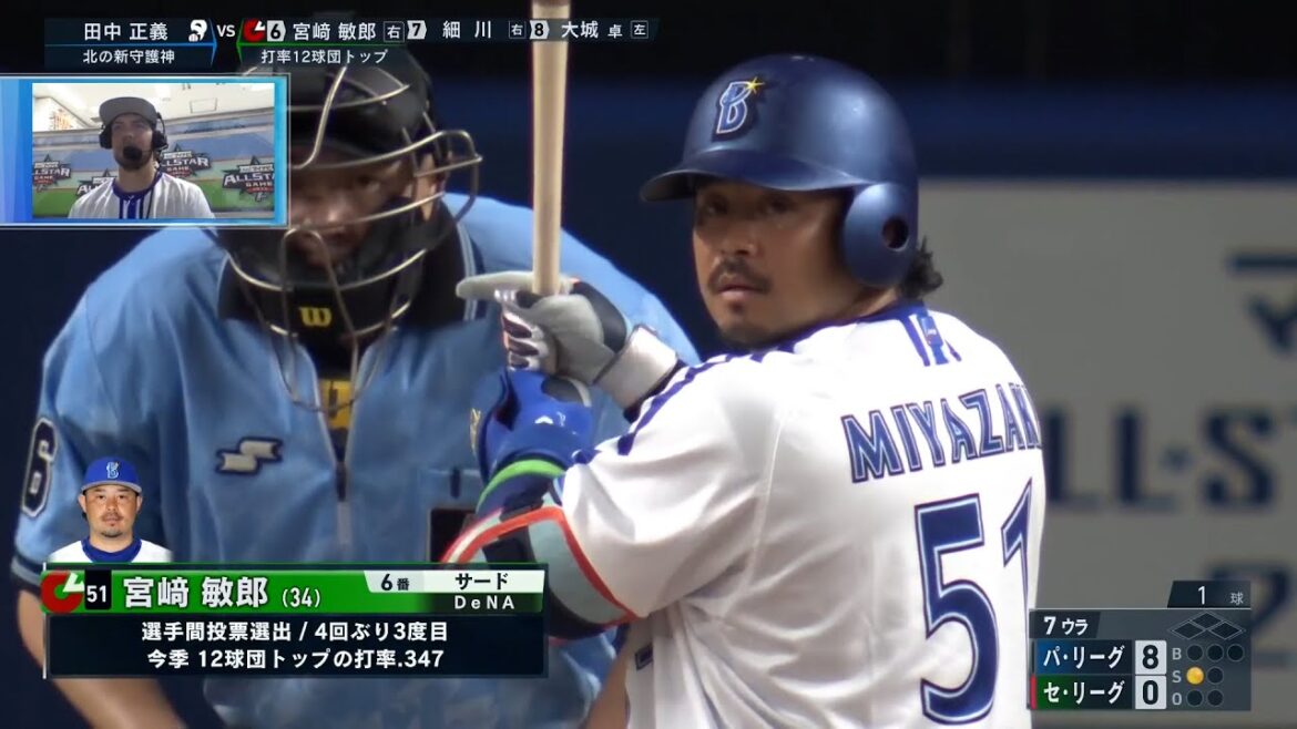 7回裏、宮﨑敏郎(DeNA)がライトにソロホームランを放ち、セ・リーグが意地を見せる!