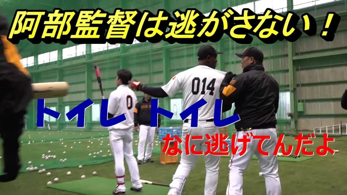 阿部監督の顔を見て逃げ出そうとするモタ選手を