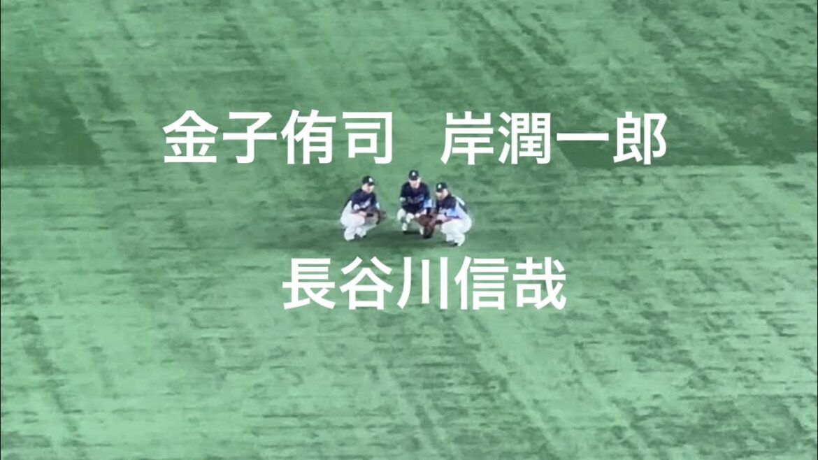 控えの佐藤龍世選手からキャッチボールの球は投げられたんですが、三人ともしゃがんで作戦会議