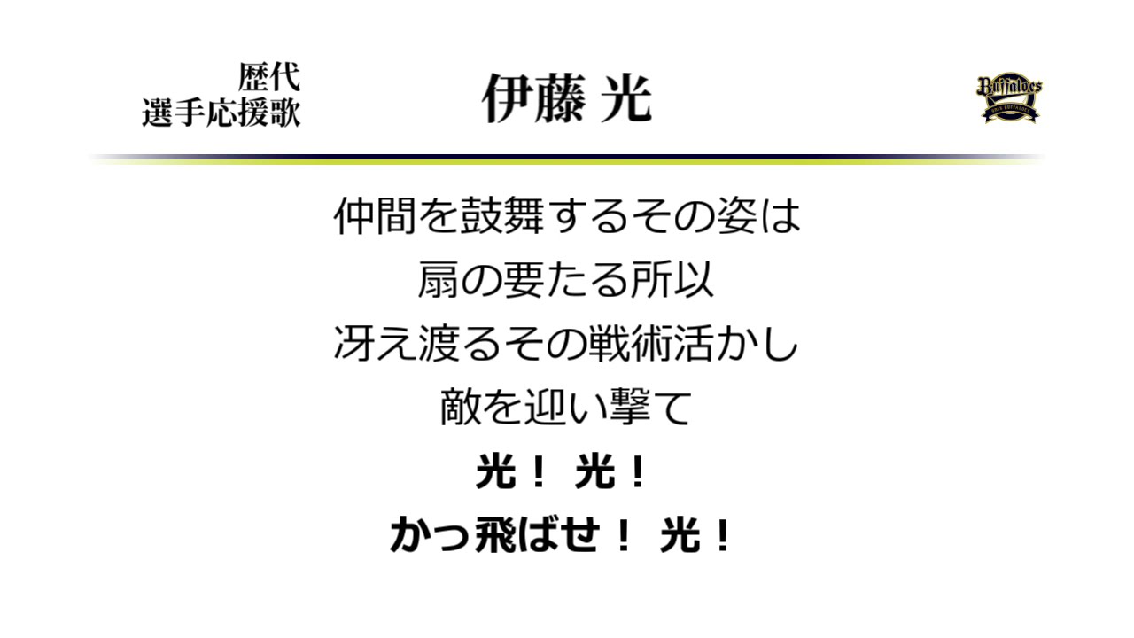 伊藤光選手のオリックス時代の応援歌です。 合併後のオリックスの応援歌は、長調曲というだけで青波路線と評価しがちですが、 この音符の多さと波打ち具合はむしろ近鉄水口路線なのでは。 ○伊藤光応援歌(DeNA時代)→https://youtu.be/-wEjEOnB00w Hikaru Itoh (Baseball Player)Orix Buffaloes (Baseball Team)YOKOHAMA DeNA BAYSTARSオリックス・バファローズなんぶふじ伊藤光応援歌横浜DeNAベイスターズ NPBHUB.COM | The Fanbase of Nippon Baseball & Nippon Professional Baseball