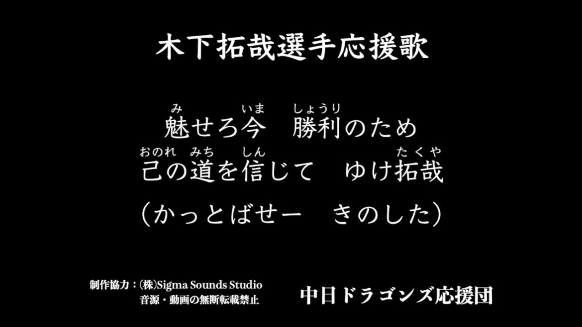 【歌詞】 魅せろ今 勝利のため 己の道を信じて ゆけ拓哉 (かっとばせー きのした) <新規団員絶賛募集中!> 中日ドラゴンズ応援団 公式サイト https://chunichiouendan.wixsite.com/dragonsouendan ※動画、画像、音源等を権利者の許可無く複製、転用、販売などの二次利用することを固く禁じます。 【制作協力】(株) Sigma Sounds Studio 【監修】中日ドラゴンズ応援団 Chunichi Dragons中日ドラゴンズ木下拓哉 NPBHUB.COM | The Fanbase of Nippon Baseball & Nippon Professional Baseball