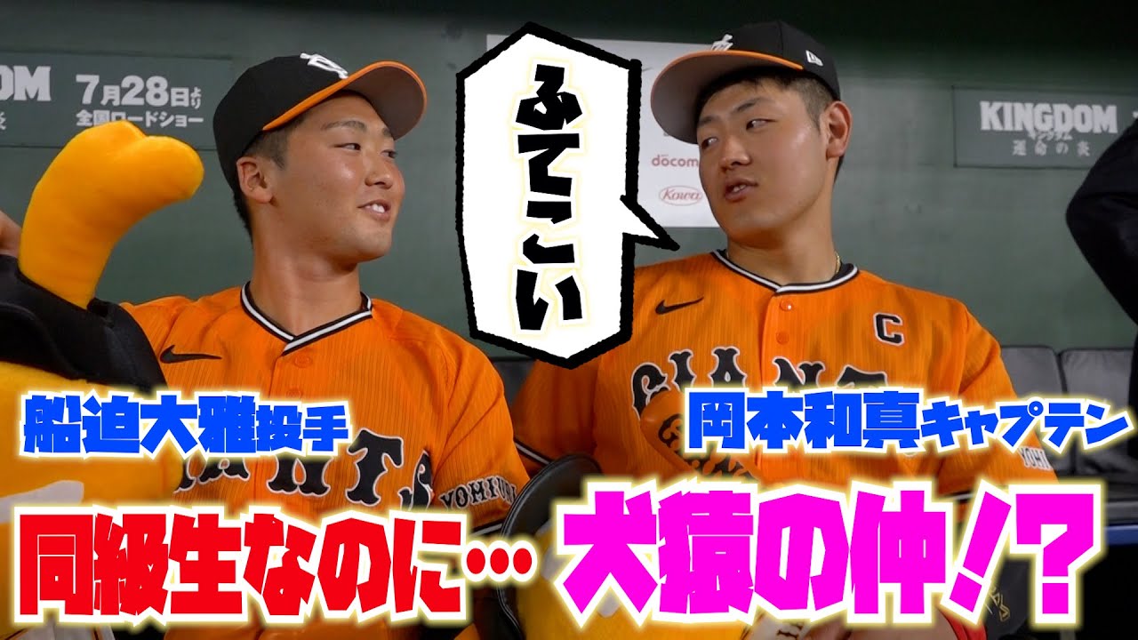 本日、ヒーローに輝いた #プロ初勝利 の #船迫大雅 投手と、22号本塁打を放つなど3打点の活躍をみせた #岡本和真 #キャプテン の同級生コンビ・・・実は犬猿の仲だった!?インタビュー前、ベンチで繰り広げられた爆笑トークを、ぜひご覧ください!